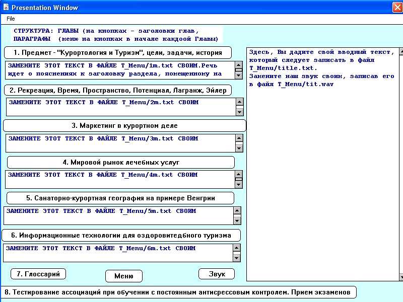 Наш E-learning : Основное окно I Корпоративная основа I Глоссарий I Эмуляция I МиниАРМ I Уважаемые коллеги! Закрываю почту, остаются Гостевая книга и Форум. Спасибо за хорошие письма, но в основном пошел спам. В ряде писем говорится: Вы - молодЦЫ. Извините, никакого МЫ нет. Ваш покорный слуга - единственный автор и исполнитель этой системы. Нужны соавторы разных профессий, интересующиеся молодые люди, даже совсем юные, чтобы выделять нужные письма. Новых друзей научу компьютеру и будет личный МиниАРМ , научу танцевать и посоветую партнера с близкими предпочтениями (их выявят диагностики), научу "похудеть" Для управления корпоративными знаниями в среде эмоционального велнеса их нужно, прежде всего идентифицировать как в целом, так и по уровням участников от директора до уборщицы. Для этого предлагается E-learning конструктор, позволяющий строить ассоциативные потоки в контекстных полях. Конструктор включает: 1. Иерархическое дерево понятий; 2. Глоссарий с мощной навигацией и предложениями вариантов ассоциативного движения; 3. "Листья на дерево" в виде текстов, звуков, картинок, клипов, файлы которых помещаются в систему структурированных папок, задаваемых пользователю 4. Интерактивное тестирование на базе Глоссария, которое изначально устанавливается автоматически; 5. Перманентный и Имманентный антистрессовый мониторинг. Первый и второй пункты целесообразно создавать на научных конференциях, превращая эпический отчет в интерактивное развитие научной темы. "Листья" произвольно задаются по материалам конференции, их может в дальнейшем изменять любой преподаватель или студент. Таким способом решается и вторая задача - создать единую систему корпоративных знаний "от директора до уборщицы". Надеемся, что найдутся желающие перейти от эпического способа общения (писатель пописывает, читатель почитывает) к интерактивному |