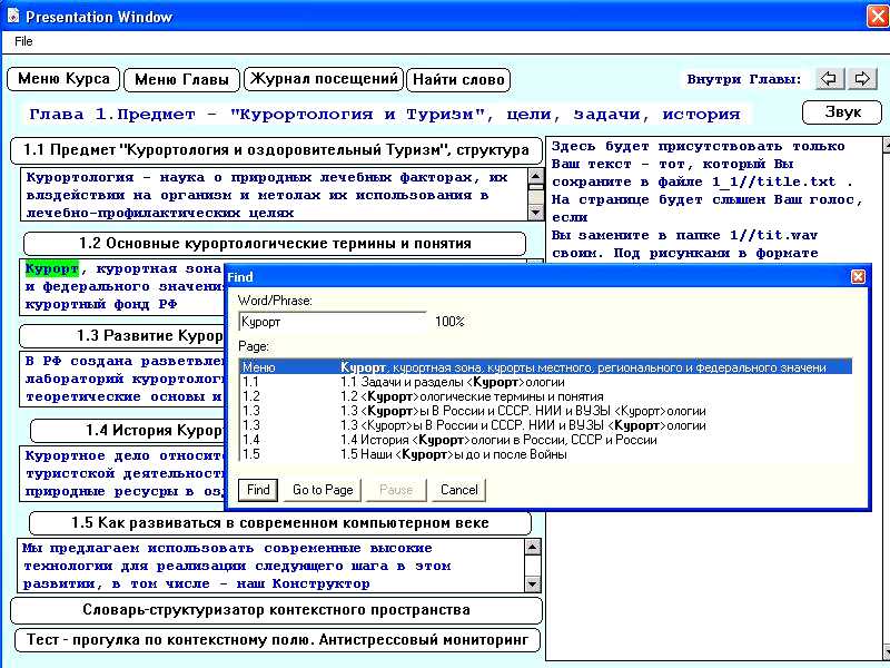 Далее, Меню первого раздела с вызванным Глоссарием